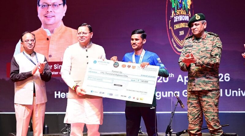 देहरादून, न्यूज़ आई : सीएम धामी श्रीनगर में हेमवती नंदन बहुगुणा गढ़वाल विवि के चौरास परिसर में आयोजित सूर्य देवभूमि चैलेंज 2.0 प्रतियोगिता के समापन समारोह पर पहुंचे। इस दौरान सेना के जवानों और छात्रों ने सीएम का भव्य स्वागत किया।
